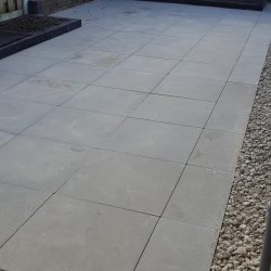 Vervolgens hebben we de rest van de tuin aangepakt. De eerste stap was het verwijderen van de huidige bestrating en beplanting. Daarna is de nieuwe bestrating geplaatst, op basis van de tekening die vooraf is gemaakt. Voor de bestrating is gebruik gemaakt van 60×60 cm tegels in een mooie zwart/grijze kleurstelling onder de overkapping, in de rest van de tuin is een grijze kleur gebruikt. Verder zijn er verhoogde borders geplaatst aan de rand van het terras, welke zijn beplant en bedekt met Frans boomschors voor een mooie afwerking.